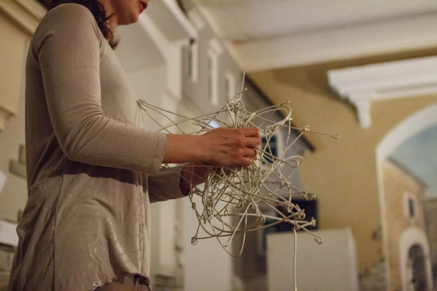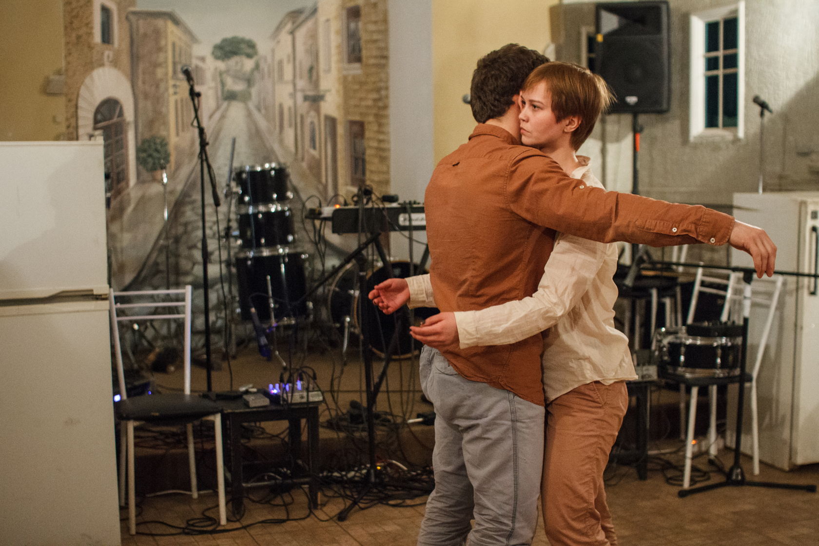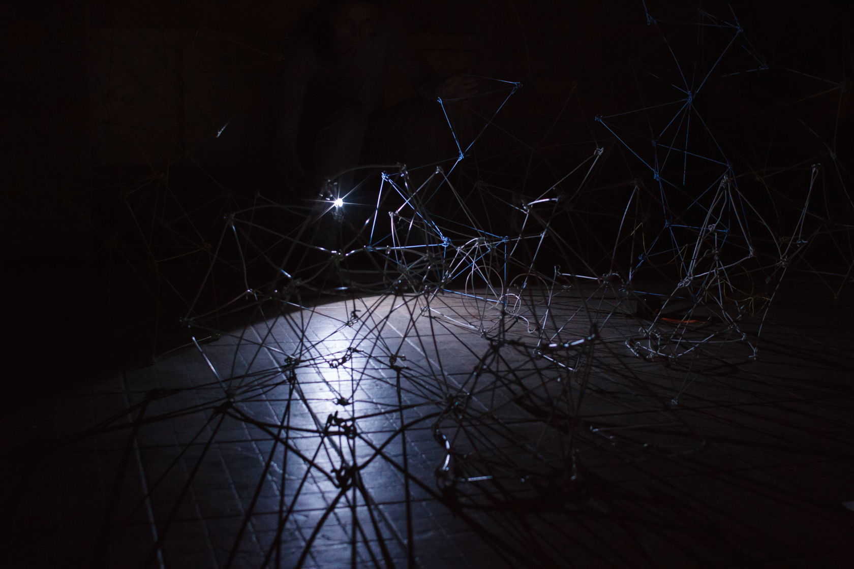А следующий номер программы — «К философии нового искусства», — действительно заставил что-то почувствовать. На одном конце сцены спиной к зрителям сидит человек и монотонным голосом читает лекцию по философии. На другом — музыкант, перед которым разложены инструменты или их часть, из них он извлекает отвлекающие и раздражающие, но атмосферные звуки. Между ними пространство на сцене принадлежит девушкам, танцующим странный танец. Сначала они двигаются под тёмной эластичной тканью, к концу лекции — уже вне её. Их движения пластичны, они как бы визуализируют странные звуки, показывают реакцию тела на них. Музыка то коробит, то растягивает, то грузит, то сносит, то роняет... Зрители в зале вынуждены сдерживать свои реакции, а люди на сцене абсолютно раскрепощены в проявлении того, что чувствуют в данный момент. Рядом со сценой, под лампой сидит девушка. На её руки направлена камера, и мы можем наблюдать, как она рисует то, что видит вокруг себя и как чувствует происходящее. Я смутно помню, о чем была лекция. Помню что-то о вытеснении на периферию сознания, о восприятии нескольких действий, происходящих одновременно, о невозможности сосредоточения на чем-то одном. Действительно, сконцентрироваться невозможно. Ты находишься в каком-то шизофреническом сне, пытаешься ловить отдельные фрагменты, не получается, пытаешься вникнуть в смыслы, но это невозможно по умолчанию. Недоумение сменяет паника, которую сменяет раздражение и гнев, и, в конце концов, ты просто перестаешь цепляться за фрагменты реальности и будто уходишь, при этом погружаясь в общее действие, ты сам становиться этим действием, одним большим воспринимающим и принимающим чувствованием. Тебе не страшно, ведь ты не один такой, вас полный зал. И ты уверен, что со всеми остальными происходит то же... Когда все закончилось, зрители с минуту сидели в молчании.